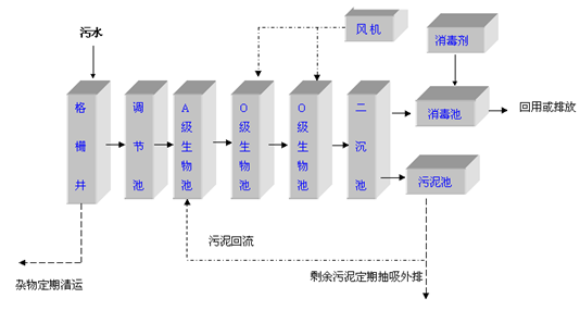 廢水經格柵攔截去除水中廢渣、紙屑、纖維等固體懸浮物,進入調節池,在調節池內均質、均量后經泵提升至A級生物池,在A級生物池段異養菌將 污水中可溶性有機物水解為有機酸,使大分子有機物分解為小分子有機物,不溶性的有機物轉化成可溶性有機物,將蛋白質、脂肪等污染物進行氨化。在O級生物池段存在好氧微生物及消化菌,其中好氧微生物將有機物分解成CO2和H2O;在充足供氧條件下,硝化菌的硝化作用將NH3-N氧化為NO3-,通過回流控制返回至A級生物池,在缺氧條件下,異氧菌的反硝化作用將NO3-還原為分子態氮,接觸氧化池出水自流進入沉淀池進行沉淀,沉淀池出水進入過消毒池進行二氧化氯消毒,消毒出水達標排放。
